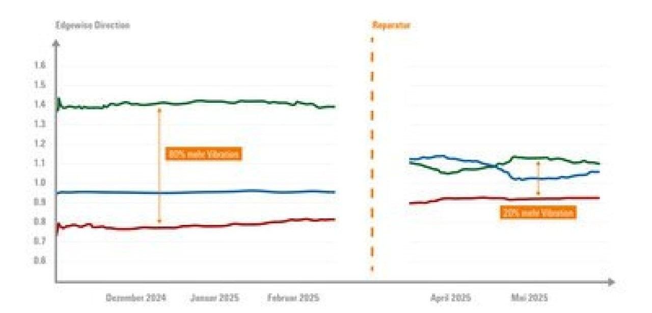 Jährliches Vibrationsmonitoring mit BLADEcontrol bestätigt vierfachen Einbruch nach Sanierung